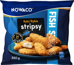 Brambory uvaříme ve slupce, necháme chvíli vychladnout, poté oloupeme a nakrájíme na středně velké kusy. Červenou cibuli nakrájíme na tenké plátky, bylinky nasekáme najemno. Cibuli a bylinky smícháme s bramborami a dochutíme solí, pepřem, hořčicí a bazalkovým pestem. Rybí stripsy Nowaco pečeme v troubě dle návodu na obalu.